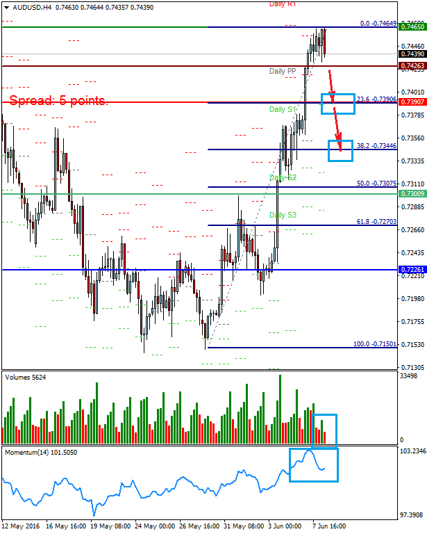 Техническая картина: Цена находится выше уровня разворота PIVOT 0.7426. Объемы перед открытием торгов в Европе порастают. Momentum развернулся вниз.
