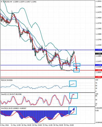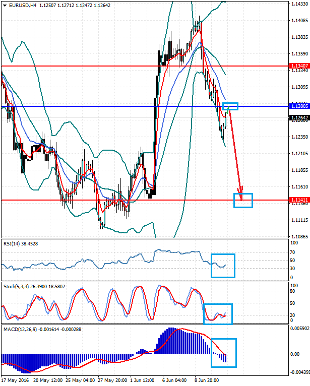 Новостной фон: Пара пытается корректироваться вверх на волне локальной перепроданности перед заседанием ФРС и решением Британии по членству в ЕС. Техническая картина: Цена находится ниже средней линии границ полос Боллинджера, ниже ЕМА 5 и ЕМА 13. RSI разворачивается вверх. Стохастики выходят из зоны перепроданности. MACD ниже нулевой отметки и демонстрирует ослабление снижения. Индикаторы подтверждают друг друга.