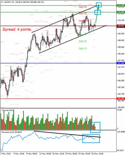 USDJPY Новостной фон: Пара консолидируется под уровнем 110.00 в ожидании публикации новых данных по ВВП США за первый квартал, а также выступления главы ФРС Дж. Йеллен от которой ждут сигнала о возможности повышения ставок в июне или вообще этим летом. Рост ВВП по сравнению с предыдущим релизом, а также позитивный сигнал от Йеллен окажут паре поддержку, так как усилится игра инвесторов на разнице процентных ставок между ФРС и Банком Японии.