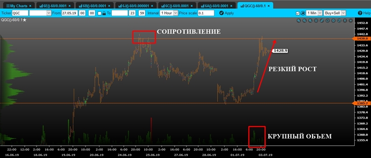 Техническийанализ финансовых рынков на неделю 01.07-05.07.2019 EUR/USD Евро продолжает торговаться в небольшой локальной консолидации чуть ниже уровня сопротивления/локального максимума 1.1395. Таким образом, наш предыдущий сценарий остается актуальным: мы можем рассмотреть пробой данной отметки, что позволит нам открывать длинные позиции. Пробойное движение должно быть уверенным, резким и на крупном объеме, что будет более точным и надежным сигналом для входа в рынок. Стоп лосс стоит ставить чуть ниже пробойного объемного бара. Потенциал сделки составляет более 100 пунктов. Итог: длинные позиции послеуверенного пробоя уровня сопротивления. GBP/USD Фунт продолжает торговаться в локальной консолидации между уровнем поддержки 1.2520 и уровнем сопротивления 1.2796. Также необходимо отметить, что крупный объем сконцентрирован в данном диапазоне, таким образом, мы можем предположить, что крупные игроки набирают свои позиции в нем. Учитывая все эти факторы, мы можем открывать новые позиции только после стремительного выхода цены из данной локальной консолидации. Более того, пробойное движение должно быть поддержано крупным объемом, что будет более надежным сигналом для входа в рынок. Пока цена находится внутри диапазона, лучше оставаться вне рынка. [ Итог: новые сделки только послерезкого выхода цены из диапазона. USD/JPY Йена протестировала уровень поддержки 107.60, но не смогла его пробить, после чего возобновила свой рост. Таким образом, нам все ещё стоит отдавать небольшое преимущество длинным позициям. Тем не менее, мы можем открывать покупки только после продолжения роста на крупном объеме, что будет более точным сигналом для входа в рынок. Стоп лосс стоит ставить чуть ниже уровня поддержки. Потенциал сделки составляет более 100 пунктов. Итог: длинные позиции все ещё в приоритете.