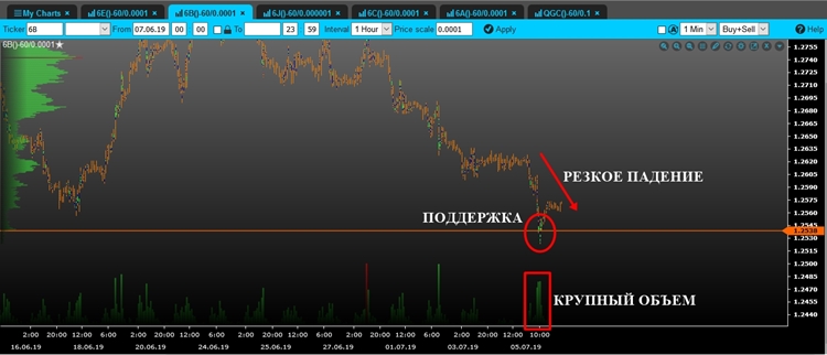 Техническийанализ парыGBP/USDна 08.07.2019 Фунт продемонстрировал значительное и резкое падение цена на крупном объеме и пробил предыдущий уровень поддержки. Тем не менее, после образования нового объемного уровня 1.2497, пара скорректировалась вверх. Несмотря на это нам стоит рассмотреть сценарий его пробоя, так как цена торгуется вблизи него + сильный локальный нисходящий тренд. Это позволит открывать короткие позиции по данному инструменту. Пробойное движение должно быть уверенным и на крупном объеме, что будет более точным и надежным сигналом для входа в рынок. Стоп лосс стоит ставить чуть выше пробойного объемного бара. Потенциал сделки составляет более 120 пунктов. Что касается сентимента рынка, то данный технический индикатор полностью подтверждает наш торговый сценарий открытия коротких позиций по фунту, так как большинство розничных трейдеров находятся в длинных позициях (торговля против «толпы»).