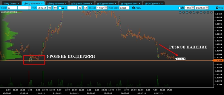 Техническийанализ парыEUR/USDна 09.07.2019 Евро продолжило свое резкое падение и в данный момент торгуется вблизи уровня поддержки/нижней границы локального диапазона 1.1185. Учитывая, что движение было на крупном объеме, мы можем рассмотреть сценарий пробоя данной отметки, что позволит открывать короткие позиции.
