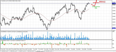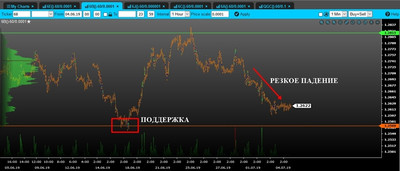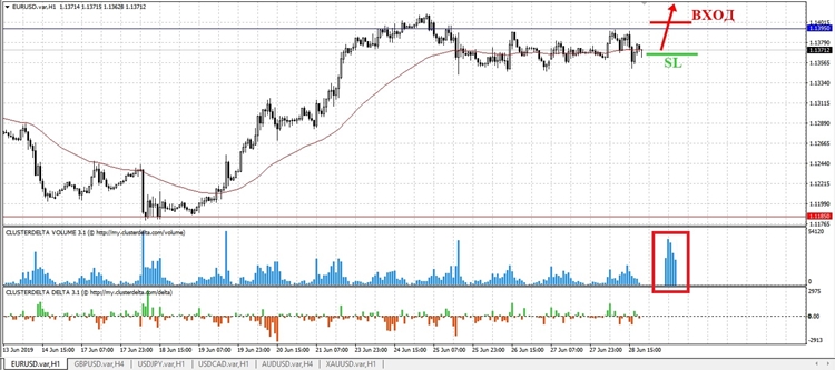 Пробойное движение должно быть стремительным, уверенным и поддержано крупным объемом, что будет более точным и надежным сигналом для входа в рынок. Стоп лосс стоит ставить чуть выше пробойного объемного бара. Потенциал сделки составляет более 100 пунктов.