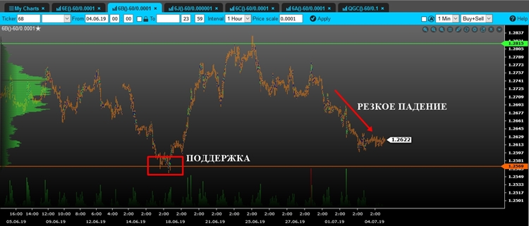 Техническийанализ парыGBP/USDна 05.07.2019 Фунт продемонстрировал резкое и стремительное падение и сейчас торгуется вблизи уровня поддержки/нижней границы локального диапазона 1.2520. Учитывая, что движение было на крупном объеме, мы можем рассмотреть сценарий пробоя данной отметки, что позволит открывать короткие позиции по фунту. Пробойное движение должно быть уверенным и поддержано крупным объемом, что будет более точным и надежным сигналом для входа в рынок. Стоп лосс стоит ставить чуть выше пробойного объемного бара. Потенциал сделки составляет более 120 пунктов. Если цена продолжает торговаться внутри консолидации, лучше оставаться вне рынка. Что касается сентимента или настроения рынка, то данный технический индикатор полностью подтверждает наш торговый сценарий открытия коротких позиций по фунту, так как большинство розничных трейдеров находятся в длинных позициях (торговля против «толпы»).