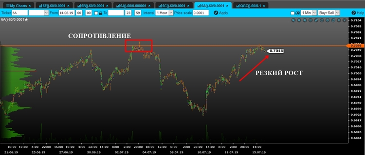 Техническийанализ парыAUD/USDна 16.07.2019 Австралийский доллар продемонстрировал значительный и резкий рост. В данный момент цена тестирует уровень сопротивления/локальный максимум 0.7036. Таким образом, мы можем рассмотреть сценарий пробоя данной отметки, что позволит нам открывать длинные позиции по этой валютной паре. Пробойное движение должно быть уверенным, стремительным и поддержано крупным объемом, что будет более точным и сильным сигналом для входа в рынок. Стоп лосс стоит ставить чуть ниже пробойного объемного бара. Потенциал сделки составляет более 80 пунктов. Что касается сентимента рынка, то данный технический индикатор полностью подтверждает наш торговый сценарий открытия длинных позиций по австралийскому доллару, так как большинство розничных трейдеров находятся в продажах (торговля против «толпы»).