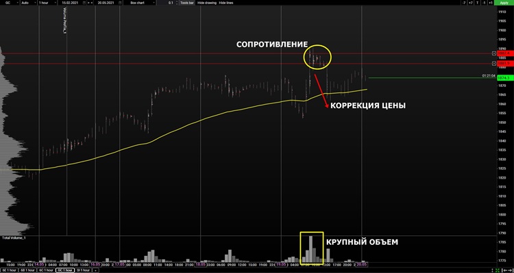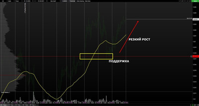 Технический анализ парыXAU/USDна 31.05.2021 Золото протестировал уровень поддержки 1889.50 – 1894.70, но цена не смогла пробить данную отметку. Как следствие, пара возобновила свой рост. Стоит отметить, что тест уровня был на крупном объеме, который был сконцентрирован внизу движения. Это означает, что крупные покупатели «откупили» цену и благодаря этому оттолкнули цену вверх. Кроме этого стоит выделить локальный восходящий тренд по золоту.
