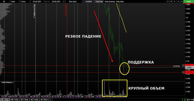 Пробойное движение должно быть стремительным и поддержано крупным объемом, что будет более точным и надежным сигналом для входа в рынок. Стоп лосс стоит ставить чуть выше пробойного объемного бара. Потенциал сделки составляет около 150 пунктов.