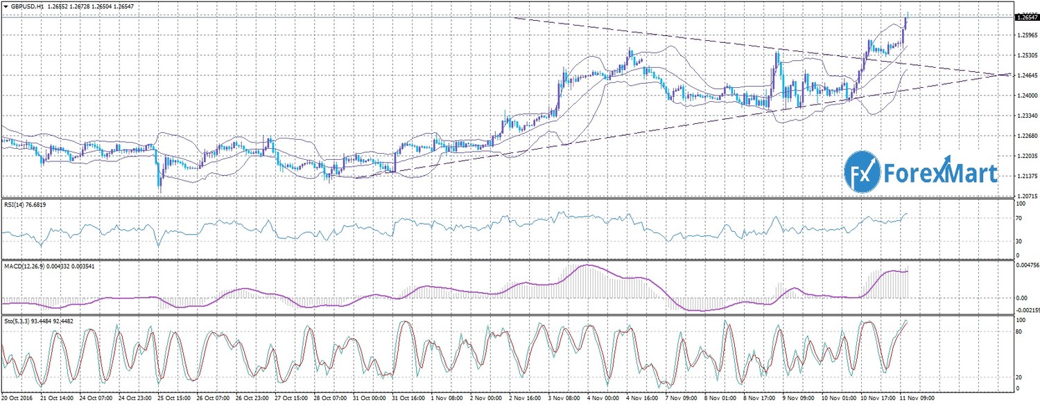 В последний торговый день прошлой недели, пару снизилась до 1,0830. Победа республиканца Дональда Трампа посеяла панику на рынке и заставила инвесторов всего мира скупать, франк, доллар США, американские акции и другие активы, в том числе и золото. Доходность облигаций в Америке достигла высоких уровней за 10 месяцев. Как только доходность перестала демонстрировать рост, котировки перешли в коррекционную фазу. Трейдеры не исключают возможности, что политика Трампа может привести к росту инфляции. На торгах в Азии, сегодня, курс снижался до 1,0773. Сегодня предполагается движение с V-образной моделью с целью 1,0856. 14 ноября также ожидается выступление главы ЕЦБ в 18.45 по МСК. Техническая картина свидетельствует о продаже европейской валюты - MACD и Стохастик подтверждают друг друга. После пробоя локального минимума 1,07725 давление на евро усилится. Но сейчас важнее фундаментальные данные.