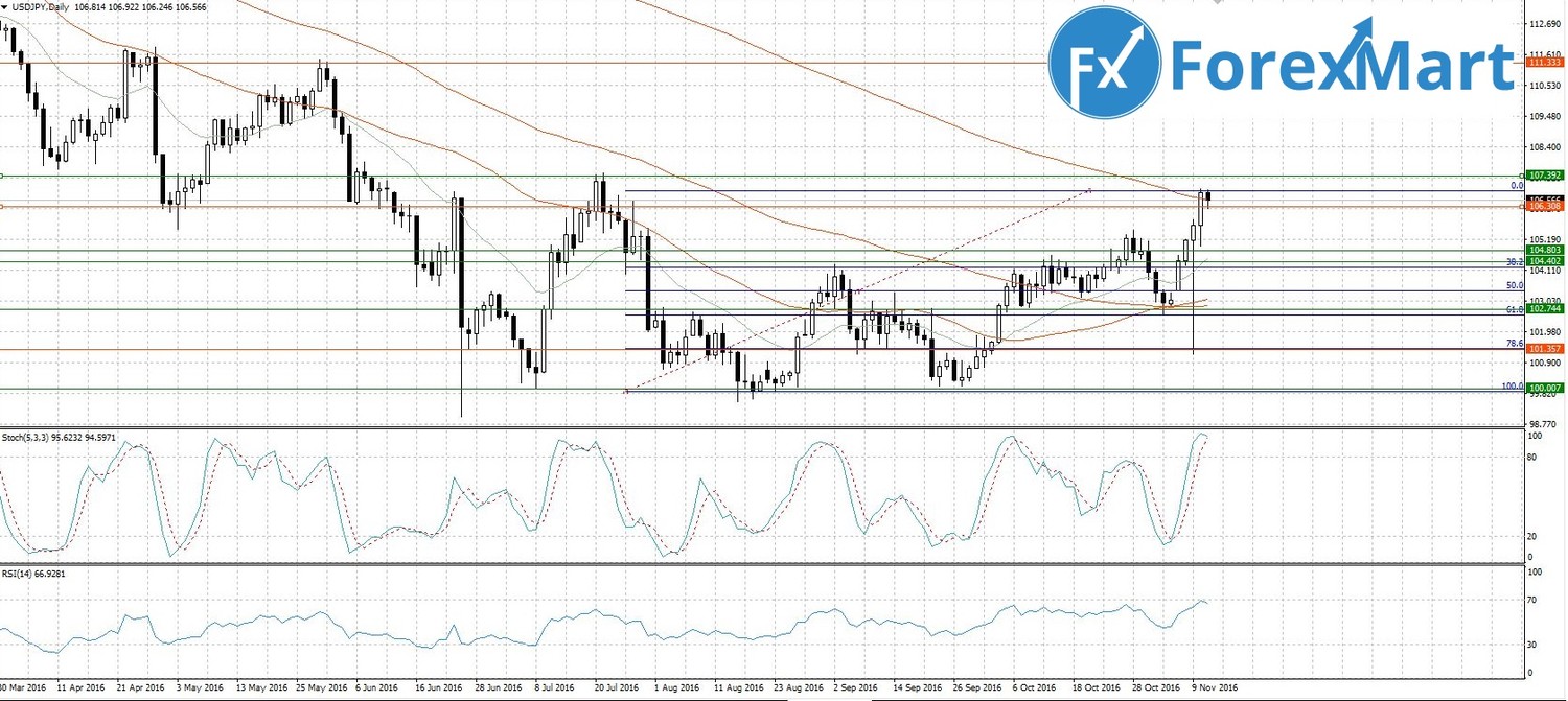 Валютная пара доллар/иена в ходе вчерашних торгов показала уверенный рост, продолжая обновлять локальные максимумы, следующая линия сопротивления на этом пути 107.40. Доллар усиливается относительно всех основных валют, иена не возражает против такого движения, даже наоборот. Нужен ли Америке сильный доллар - это другой вопрос. На сегодняшний день делать прогнозы еще рано - новый президент США не вступил в должность. Технически лучше входить в рынок на отскоке или после пробития сильных уровней. Сейчас на дневном таймфрейме пара подошла к уровню, усиленному скользящей средней с периодом 200, стохастик в зоне перекупленности, RSI тоже находится на границе экстремумов, в ближайшее время можно рассчитывать на коррекцию.