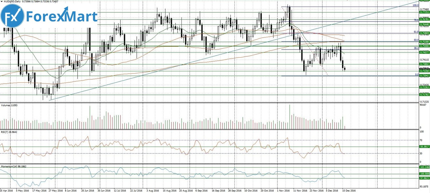Валютная пара австралийский доллар/доллар США торгуется в области локальных минимумов, достигнутых на “эффекте Трампа”. Пробитие и закрепление за горизонтом 0.73350 даст повод говорить о развитии по меньшей мере среднесрочного медвежьего тренда. Тем более ФРС США собирается ужесточить кредитно-денежную политику в 2017 году. Но более вероятным сценарием кажется ложный пробой и уход во флет для дальнейшего набора сил. Покупки – против тренда, продажи пока неактуальны, поскольку пара находится на границе области перепроданности.