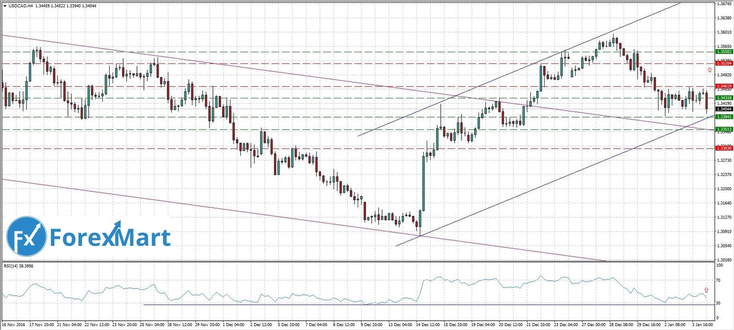 Пара USD/CAD продолжает движение в рамках восходящего канала, сформированного 14 декабря, и тестирует нижнюю его границу. В ближайшем будущем ожидается отскок от уровня поддержки 1,3385 и дальнейшее движение пары вверх выше уровня 1,3550. Индикатор RSI также демонстрирует тест линии поддержки. Альтернативным вариантом развития событий станет развитие нисходящего движения с падением котировок канадского доллара ниже уровня 1,3300. Уровни сопротивления расположены на 1,3460 и 1,3520. Важных новостей из Канады пока нет.