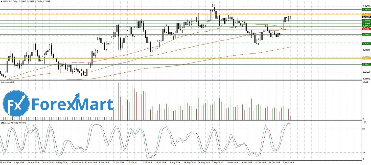 Пара новозеландский доллар/доллар США по сравнению с основными валютными парами довольно спокойно пережила выборы в США, хотя торговля шла большими объемами, волатильность оставалась в районе 100 пунктов. Цена на часовом графике находилась между скользящих средних с периодом 100 и 200 в районе сильного уровня 0.7300. В ближайшее время можно рассчитывать на продолжение роста в паре. Сегодня ожидаем решения резервного банка Новой Зеландии по процентной ставке, ожидаемое значение 2,00% уже включено в стоимость валюты, так, что если не будет сюрпризов, значительного влияния на пару это не окажет.