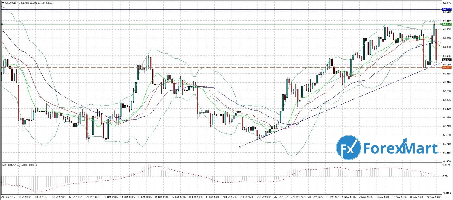 Утром в среду рубль незначительно дешевеет на фоне панических настроений рынка, вызванных победой в президентских выборах Дональда Трампа. Пара USD/RUB выглядит стабильней и крепче валют-аналогов, поскольку Трамп планирует наладить отношения с Россией. Пара находится вблизи отметки 63,97, протестировав ранее сентябрьский максимум в 64,16. Основным рычагом воздействия на рубль остается нефть Brent. Рост торгового инструмента Доллар/рубль будет иметь ограниченный характер, поскольку нефть не смогла пока закрепиться ниже отметки 45 долларов за баррель.